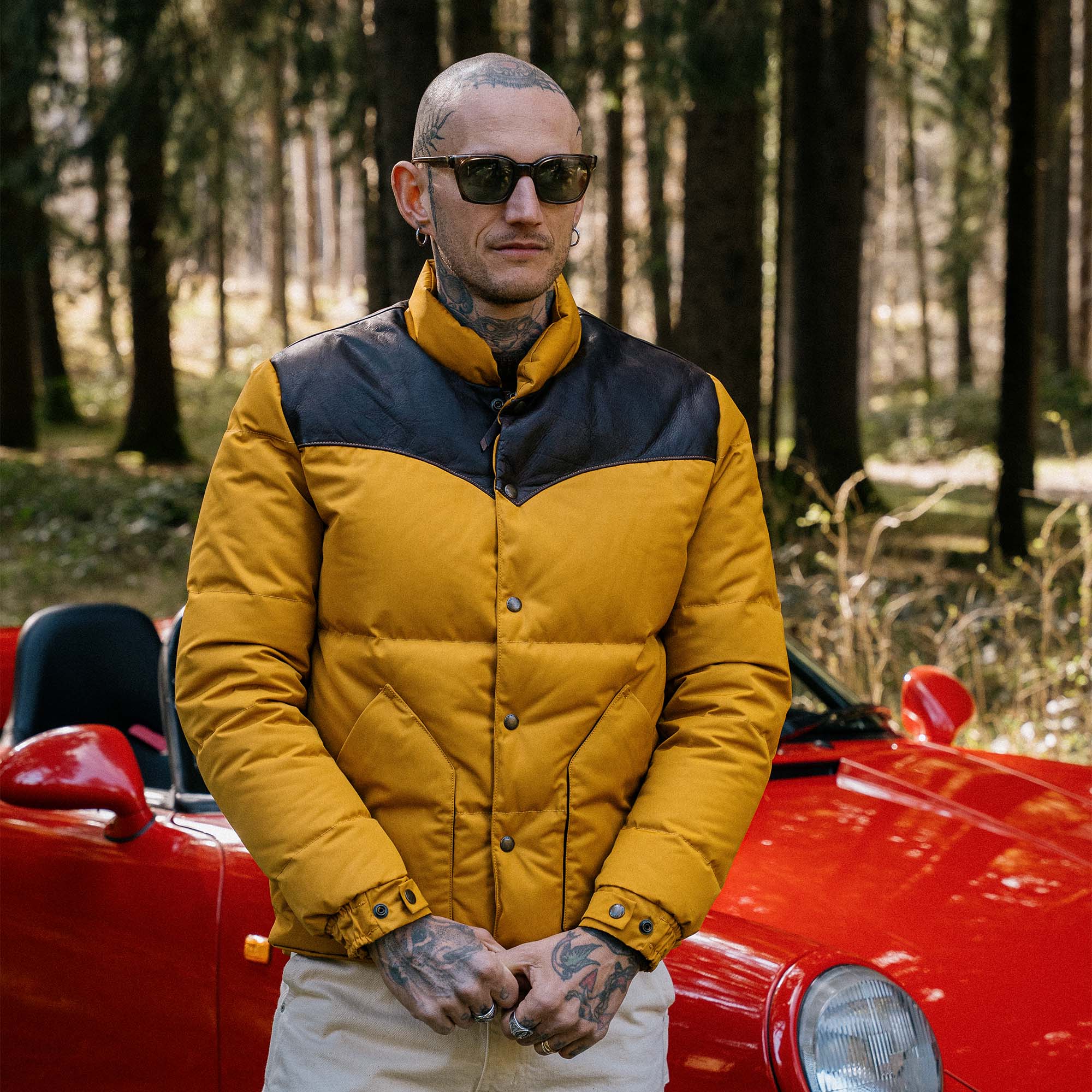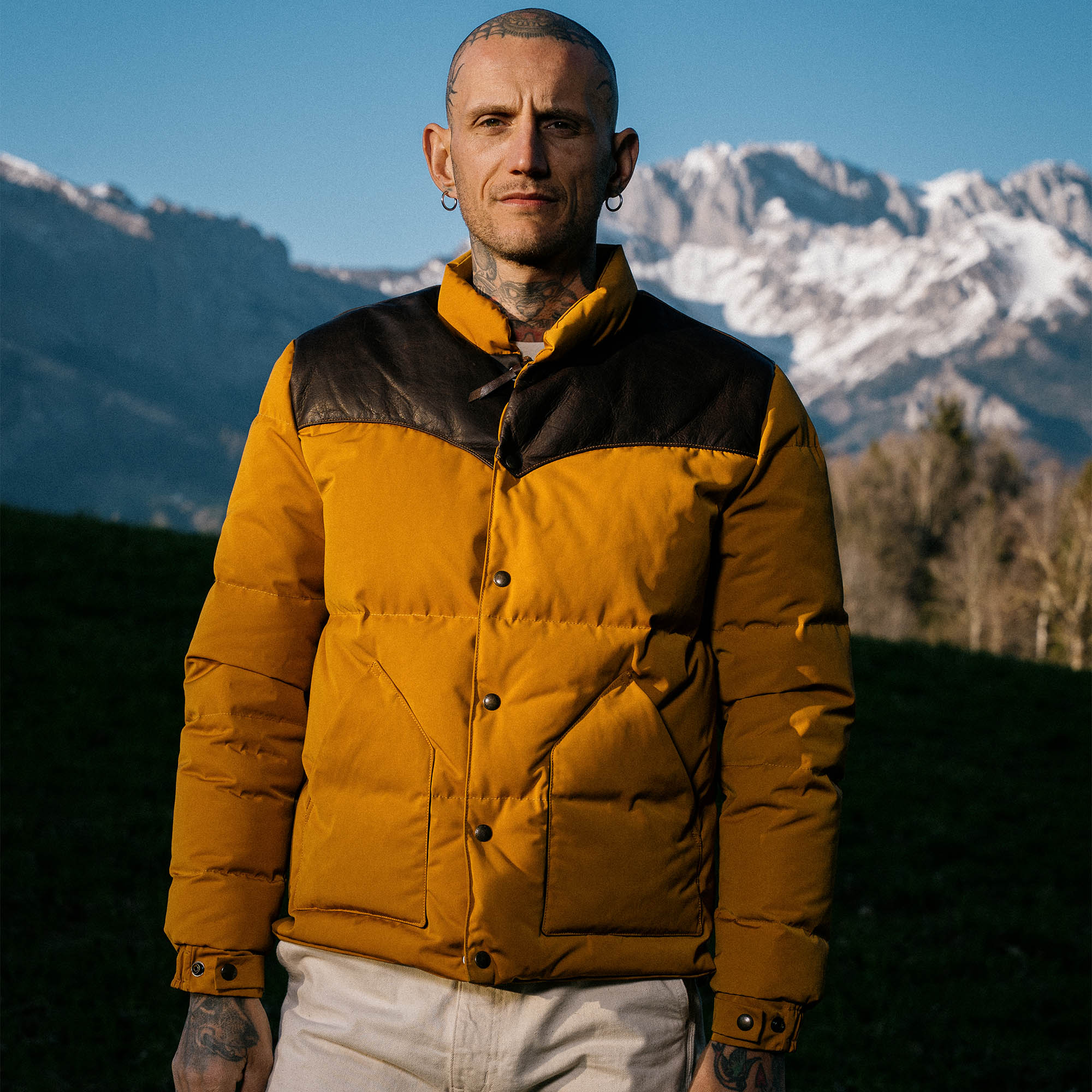 Inspired by 1960s Cowboy Jackets and revisited with a unique Italian touch, the “Bivacco” Yellow Western Down Jacket represents an authentic garment made of Recycled 80% Goose Down / 20% Feather from Tuscany (Italy) with the traditional western yoke made with Brown color Full-Grain Steerhide from Vicenza (Italy).
