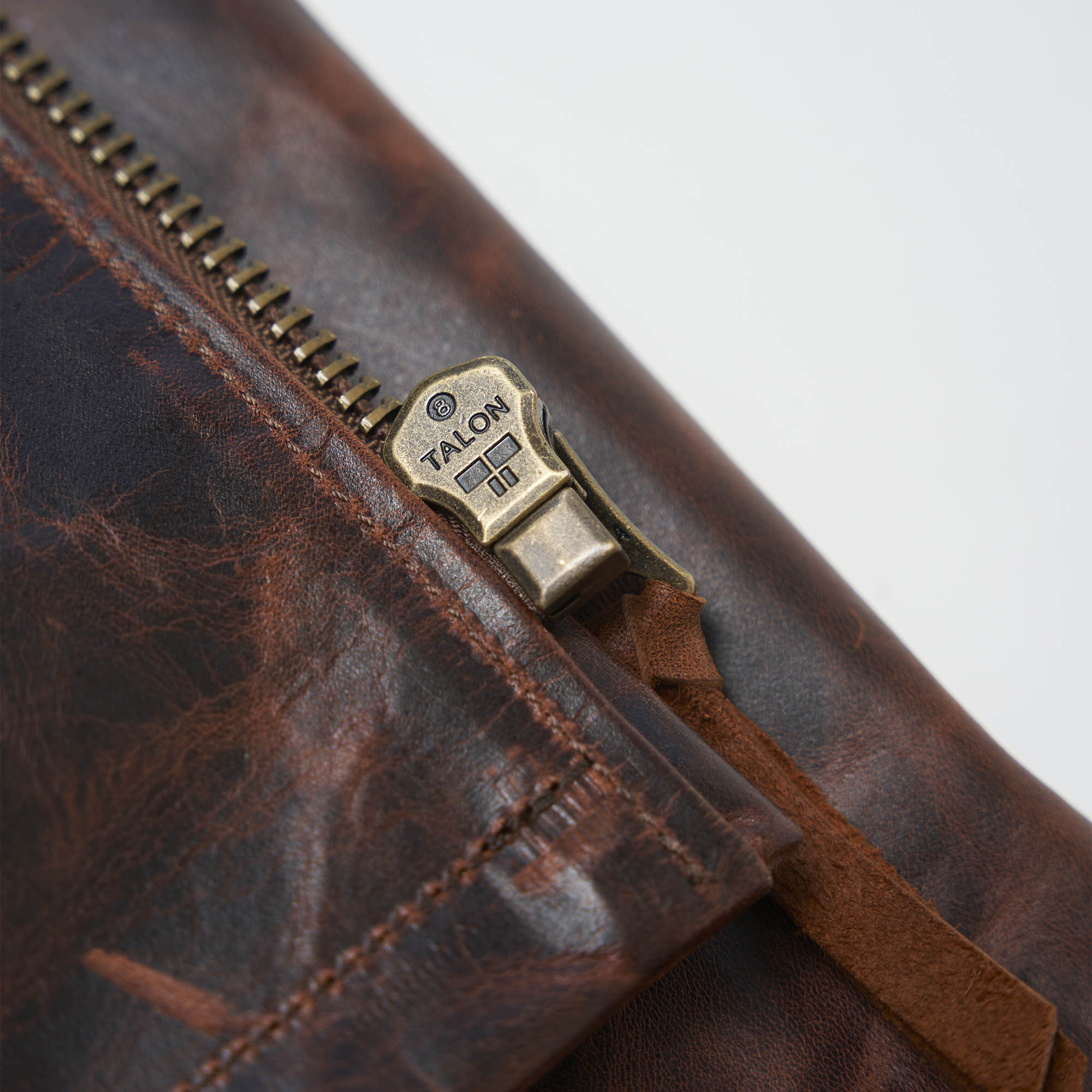 The metallic zippers by Talon® are made of antique brass with engraved markings.